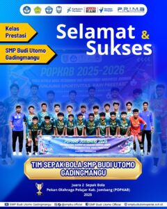 Jombang, 6 November 2025 — Prestasi membanggakan kembali diraih oleh SMP Budi Utomo Gadingmangu. Tim sepak bola sekolah ini berhasil meraih Juara 2 dalam ajang Pekan Olahraga Pelajar Kabupaten (POPKAB) Jombang 2025, yang berlangsung mulai 28 Oktober hingga 7 November 2025.